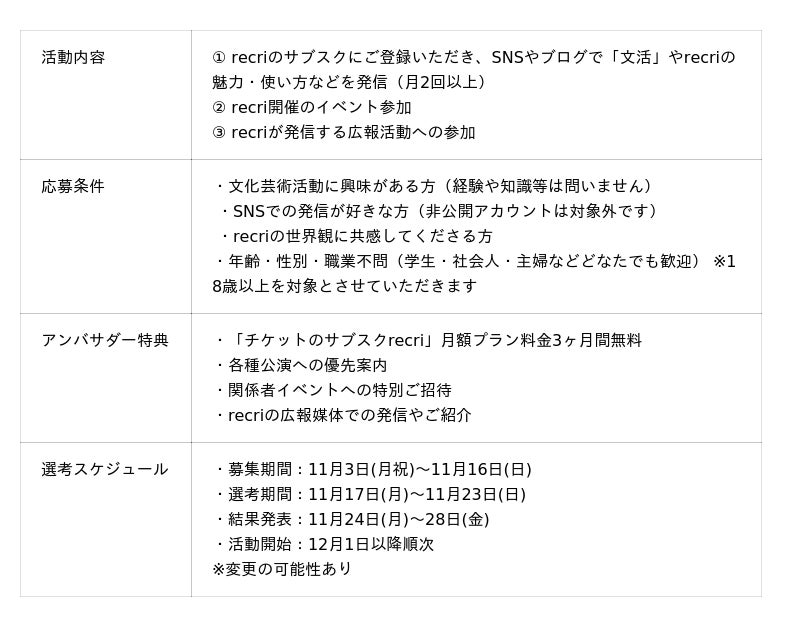 「チケットのサブスクrecri」は、より多くの人が文化芸術に触れることで、感性溢れる刺激的な世の中を目指しています。その取り組みの一環として、文化の日を記念し「文活アンバサダー」の募集を開始いたしました。アンバサダーに任命された方には、「チケットのサブスクrecri」を3ヶ月間無料でご利用いただける特典をはじめ、活動を全面的にバックアップさせていただくなど、各種特典をご用意しています。文活で心がうごいた瞬間・あなたの人生やライフスタイル、文活の素晴らしさをあなたらしい言葉で発信してください。