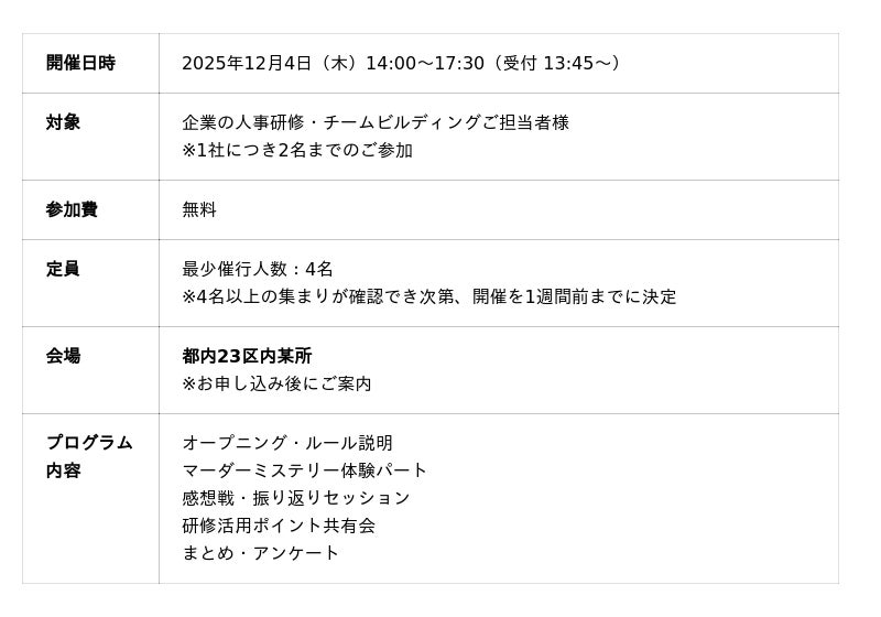 次世代のエンターテインメント体験を創造する株式会社イマーシブ・ラボ(本社:東京都渋谷区、代表取締役社長:小池弾、細川哲星、水谷優斗)は、企業の人事・研修ご担当者様を対象としたマーダーミステリー型チームビルディング研修 無料体験会を、2025年12月4日(木)に東京都内で開催いたします。