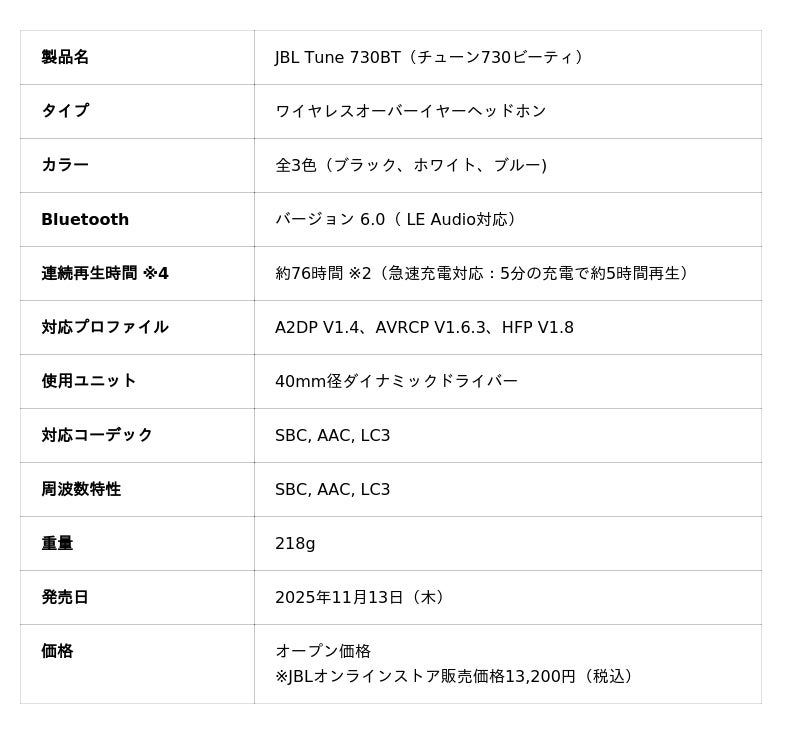ハーマンインターナショナル株式会社(本社:東京都千代田区、代表取締役:桑原拓磨)は、アメリカ カリフォルニア発祥の世界最大級のオーディオブランドであり、日本においてワイヤレススピーカー7年連続販売台数No.1※1に輝く「JBL」より、ワイヤレスオーバーイヤーヘッドホン「JBL Tune 730BT(チューン 730 ビーティ)」を2025年11月13日(木)より発売いたします。