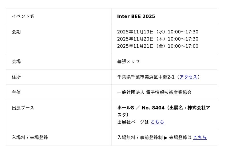 株式会社アスク(本社:東京都千代田区)は、2025年11月19日(水)〜21日(金)に幕張メッセで開催される「Inter BEE 2025」に出展いたします。