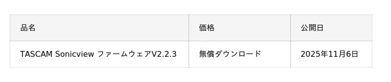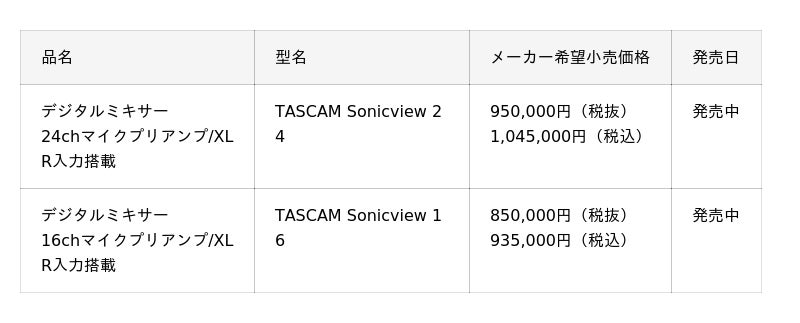 『TASCAM Sonicview 24』 https://tascam.jp/jp/product/sonicview_24/『TASCAM Sonicview 16』 https://tascam.jp/jp/product/sonicview_16/