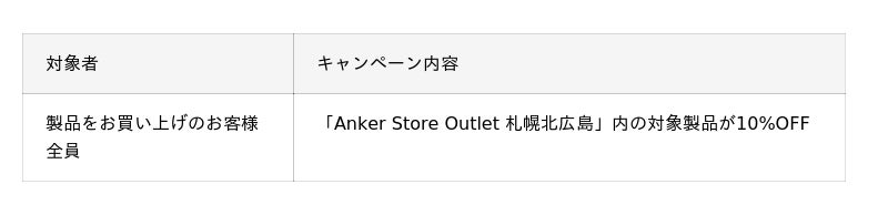 この度オープンを記念し、2025年11月14日(金)〜 2025年11月24日(月・祝)の11日間限定で「Anker Store Outlet 札幌北広島」内の対象製品を10%OFFでご購入いただけるキャンペーンを実施します。
