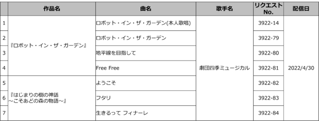 株式会社第一興商は、劇団四季オリジナルミュージカル『ロボット・イン・ザ・ガーデン』の本人歌唱映像をカラオケで初めて配信します。さらに、『ロボット・イン・ザ・ガーデン』とオリジナルファミリーミュージカル『はじまりの樹の神話〜こそあどの森の物語〜』から厳選した各3曲が、舞台の名シーン写真を見ながら歌えます。 どちらも4月30日より全国のLIVE DAM Aiでお楽しみいただけます。