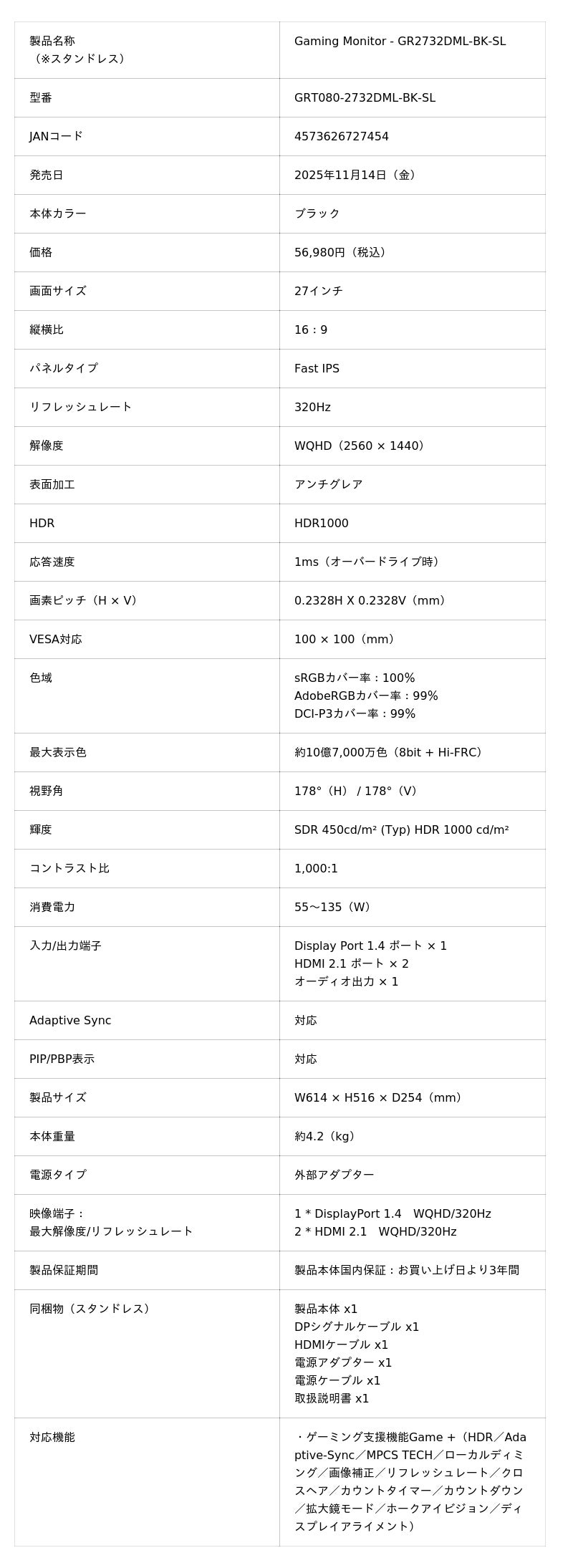 (1)Gaming Monitor - GR2732DML-BK-SL(スタンドレス)56,980円(税込)