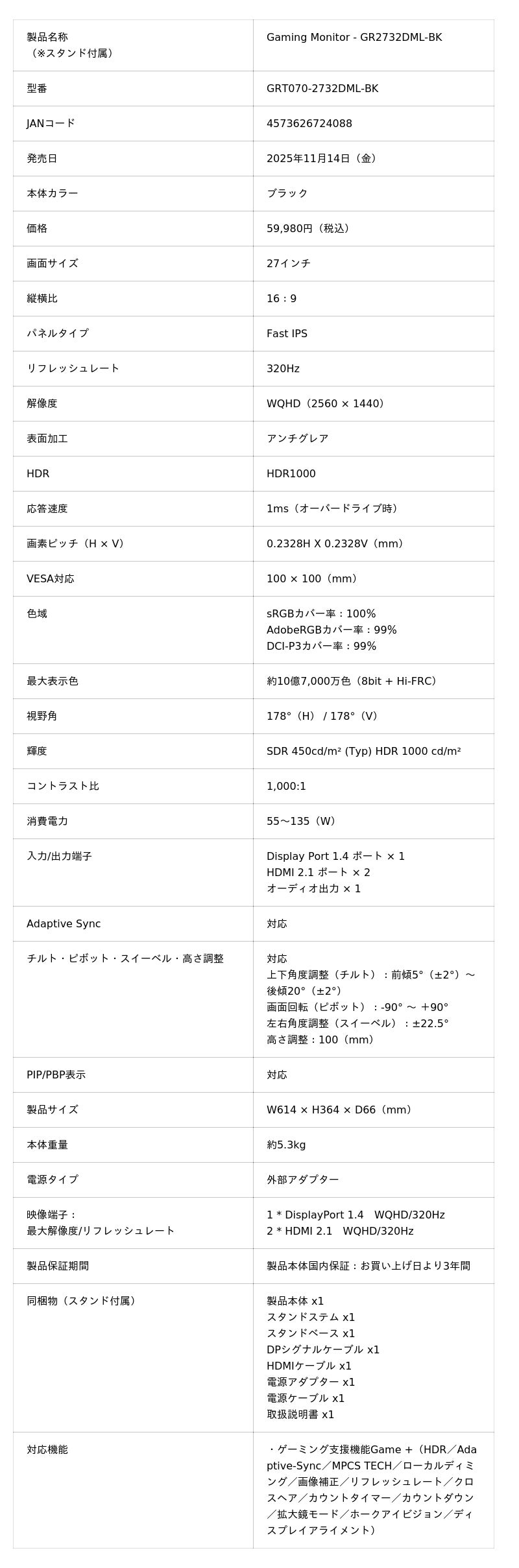 (2)Gaming Monitor - GR2732DML-BK(スタンド付属)59,980円(税込)
