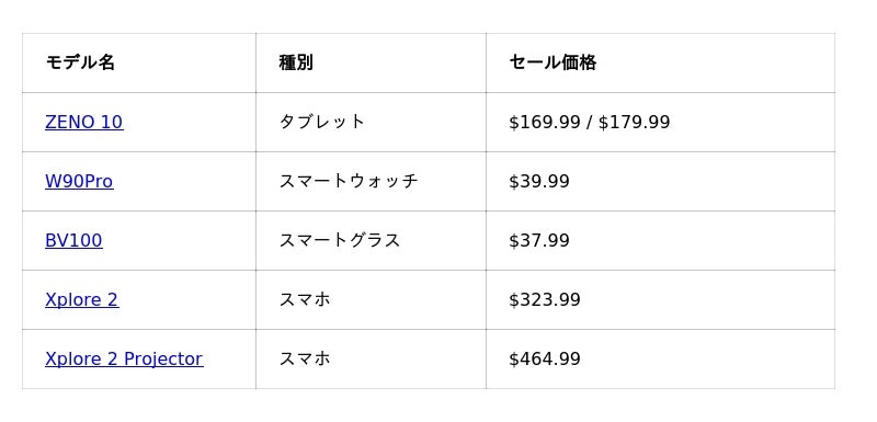 期間中は、最新タブレット 『ZENO 10』 が50%OFFの大幅割引価格になるほか、スマートウォッチ 『W90 Pro』、スマートグラス 『BV100』、高性能プロジェクター 『Xplore 2』 などの人気製品も特別価格で購入できます。