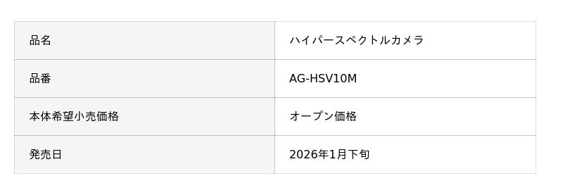 パナソニック エンターテインメント&コミュニケーション株式会社(以下、パナソニック)は、人の眼では把握が困難な光の波長情報を捉え、被写体の詳細な色情報から素材や情報を判別できるハイパースペクトルカメラ「AG-HSV10M」を2026年1月下旬に発売します。