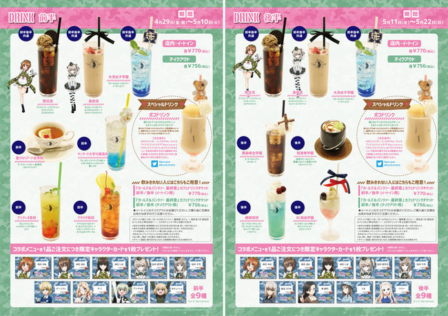 お馴染みの戦車カツをカツカレーにアレンジしたメニューをはじめ、<前半※4月29日(金・祝)〜5月10日(火)> <後半※5月11日(水)〜5月22日(日)>でラインナップが替わるフード、ドリンクをはじめ、西住流と島田流をイメージしたスイーツメニューなどをご用意。