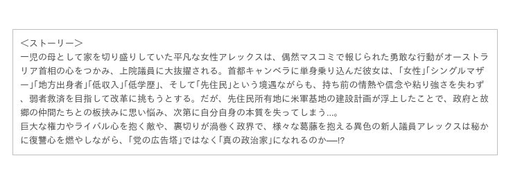 本作はオーストラリア先住民の女性アレックス(デボラ・メイルマン)が、とある恐ろしい事件をきっかけに時の政治家アンダーン首相(レイチェル・グリフィス)によって議員に抜擢され、「女性」「シングルマザー」「地方出身者」「低収入」「低学歴」そして「先住民」という境遇ながらも、持ち前の情熱や信念や粘り強さを失わず、差別や反感のなか議員活動に邁進。巨大な権力やライバル心を抱く者や裏切りが渦巻く政界で、故郷の家族や仲間を裏切る事態に陥りながらも、様々な葛藤を抱える異色の新人議員アレックスが弱者救済を目指し、自分自身が持つ信念のために改革に挑む政治ドラマです。