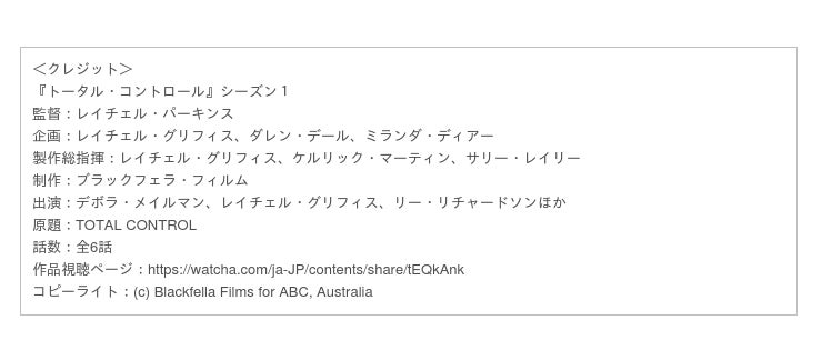この度、株式会社Watcha Japan(本社:東京都千代田区、代表取締役兼CEO:黒田 淳一)は、映画好きのための新しい月額動画配信サービス「WATCHA(ウォッチャ)」にて、AACTA賞(オーストラリア映画テレビ芸術アカデミー賞)で作品賞・主演女優賞・助演女優賞の3冠を受賞した話題作『トータル・コントロール』を2021年11月17日(水)より全6話を一挙独占配信開始いたしました。