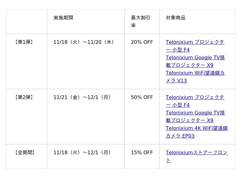 「Telonix公式ストア」は、2025年11月18日(火)から12月1日(月)まで、アマゾン年末の先行ピックセール(ブラックフライデーイベント)を実施しております。