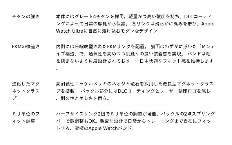 動きに寄り添う設計チタン製ハードウェアがタフな外殻を形成し、内側のFKMリンクが手首の動きに合わせて柔軟にしなります。この構造により、フィット感と耐久性を高次元で両立。まるで腕の一部のように自然に動き、日常のあらゆる動作を快適にサポートします。