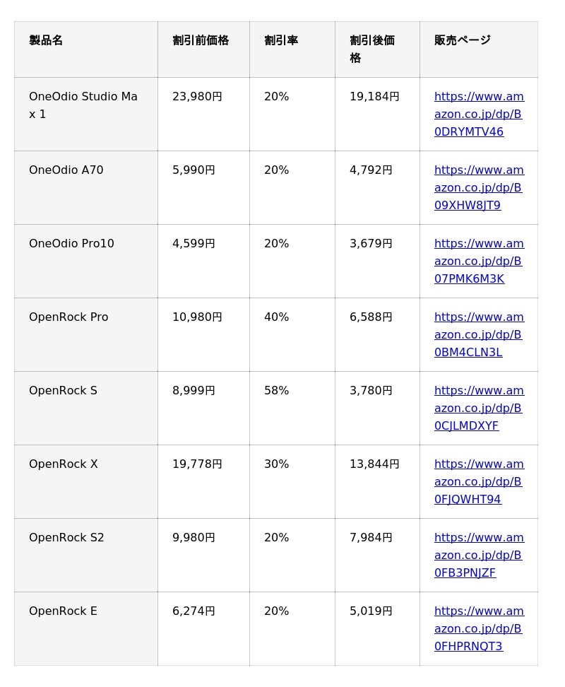 - 内容: 対象のOneOdioヘッドホン・OpenRockイヤホンが最大58%OFF