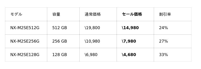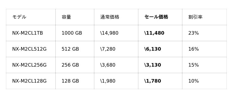 また、ご好評いただいているCFexpress 4.0 Type Bメモリーカード「NX-B3SEシリーズ」が最大38%OFFと、大変お求めやすくなっております。風景写真やポートレートなどの静止画から高画質動画撮影まで、マルチユースに最適なメモリーカードですので、動画にも挑戦したいフォトグラファーの方々におすすめです。