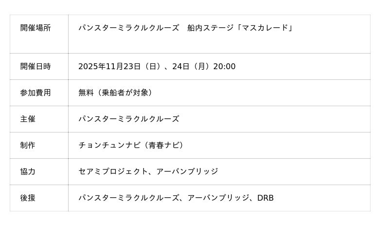 日本と韓国を運航するパンスターミラクルクルーズでの日韓文化交流を体感しながら、旅と演劇が融合した特別な時間を楽しめます。