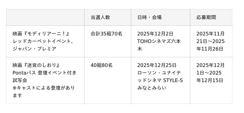 また、約8年半ぶりの来日が話題のジョニー・デップ氏の監督最新作『モディリアーニ!』ジャパン・プレミアとレッドカーペットイベント、「新しい学校のリーダーズ」SUZUKA主演の映画『迷宮のしおり』試写会へのご招待キャンペーンにおいて、Pontaパス継続会員(応募時点で31日以上利用を継続している会員)のお客さまの当選確率を上乗せします。