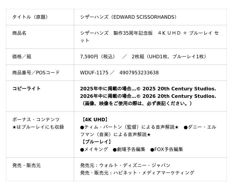 あの名作・傑作が4K UHDの超高画質で蘇る!!『シザーハンズ 製作35周年記念版』『ロッキー・ホラー・ショー 製作50周年記念版』4K UHD+ブルーレイ セット 2026年2月18日(水)発売!