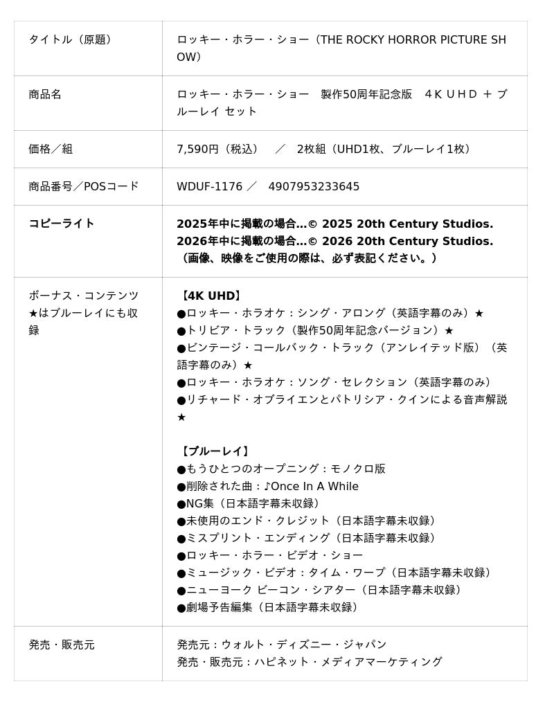 今なお世界中で熱狂的な支持を集めるロック・ミュージカル映画の金字塔『ロッキー・ホラー・ショー』の製作50周年を記念し、『ロッキー・ホラー・ショー 製作50周年記念版 4K UHD + ブルーレイ セット』を2026年2月18日(水)に発売いたします。
