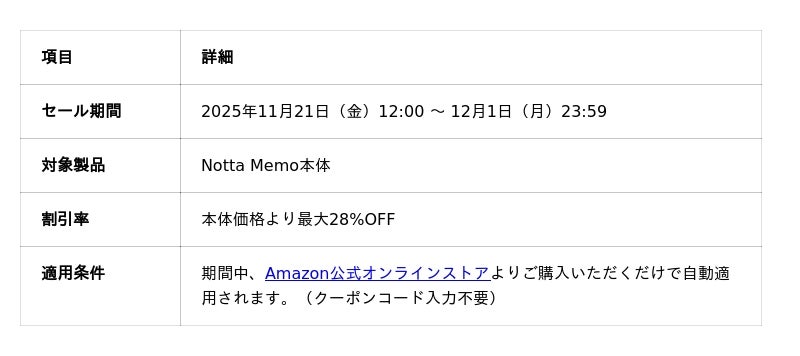 AIボイスレコーダー「Notta Memo」の開発・販売を行うNotta株式会社(本社:東京都千代田区、代表取締役:Ryan Zhang、以下Notta)は、日頃のご愛顧に感謝を込めて、一年に一度の特別割引セール「Notta Memo ブラックフライデー 2025」を公式Amazonオンラインストアにて開催いたします。