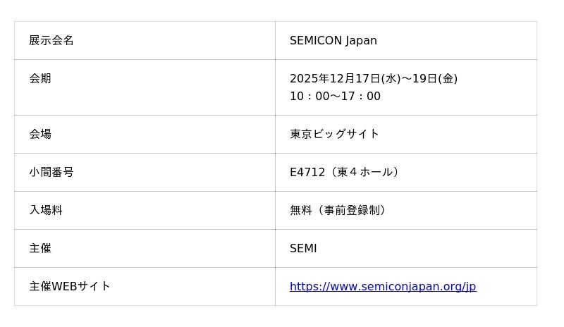 株式会社ミツトヨ(代表取締役社長:沼田恵明)は、2025年12月17日(水)から12月19日(金)まで、東京ビッグサイトにて開催される展示会「SEMICON Japan2025」に出展し測定機のソリューションなどを紹介します。