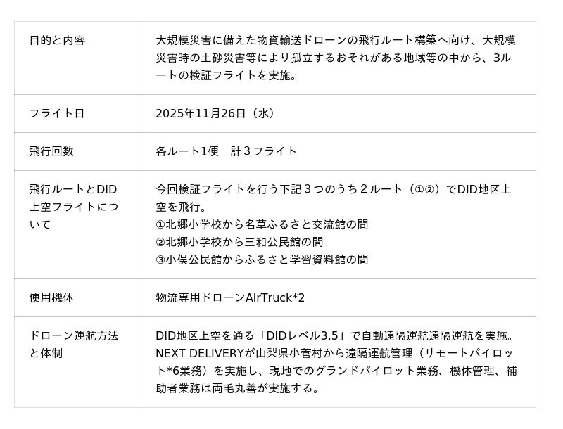 今回の飛行は、本年10月29日の国土交通省航空局標準マニュアル(機上カメラ装置により立入管理措置をとる目視外飛行-「レベル3.5*1飛行」等の改訂後、11月4日(火)に和歌山市で、NEXT DELIVERYが実施したDIDを含むルートでのレベル3.5飛行の全国初の飛行に続く、全国で2例目の試みです。