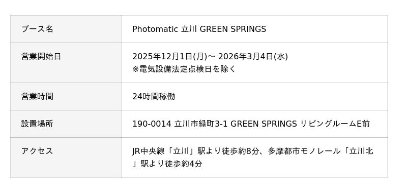 キタムラ・ホールディングス グループのピックハイブ株式会社(本社:東京都新宿区、代表取締役社長 兼 COO:大迫 由典)が運営するセルフフォトブランド「Photomatic(読み:フォトマティック)」は、東京都立川市の複合施設「GREEN SPRINGS」に、2025年12月1日(月)から2026年3月4日(水)までの期間限定でセルフフォトブースを設置いたします。