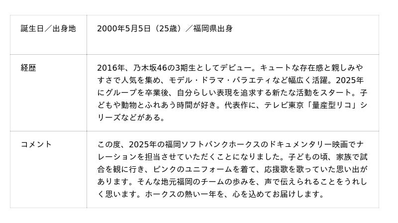 女優としてドラマや映画の話題作に出演するなど様々な分野で活躍中の与田祐希さんは福岡県出身。幼少期に家族でホークスの試合を観戦したことがあるなどホークスに親しみがあり、本作でナレーションを務めることになりました。