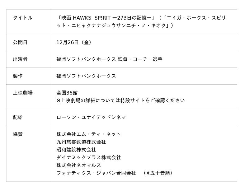 福岡ソフトバンクホークス株式会社(本社:福岡市中央区、代表取締役社長CEO:後藤芳光)は、12月26日(金)から全国36の映画館で上映する長編ドキュメンタリー「映画 HAWKS SP!RIT ー273日の記憶ー」のナレーターが女優・与田祐希さん、主題歌がSixTONESの「GONG」に決定いたしましたので、お知らせします。