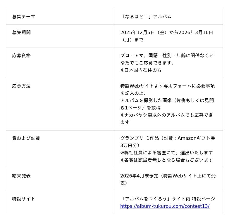 ナカバヤシ株式会社は、12月5日「アルバムの日」を記念して、「第13回 アルバム整理術コンテスト」の開催・募集開始とネットショップでのセールを2025年12月5日より行います。