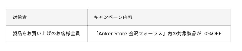 この度オープンを記念し、2025年12月18日(木)〜 2025年12月28日(日)の11日間限定で「Anker Store 金沢フォーラス」内の対象製品を10%OFFでご購入いただけるキャンペーンを実施します。