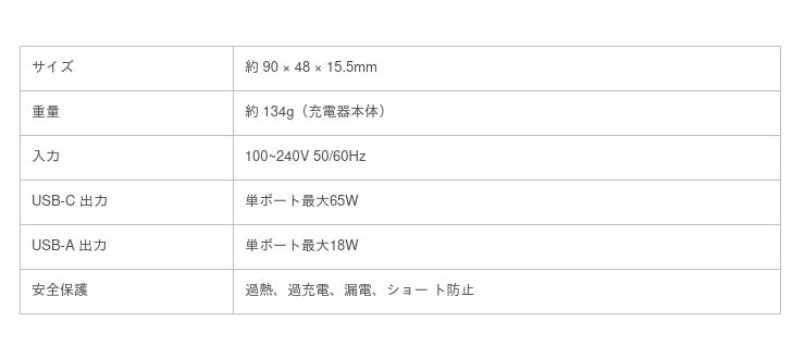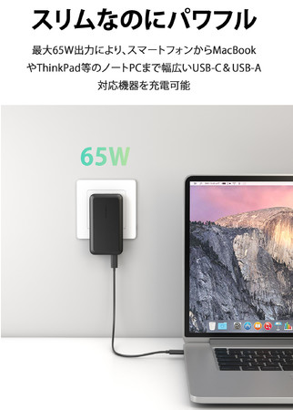 本製品は、次世代USB急速充電器シリーズの中でも抜群の利便性とコンパクトさを兼ね備え、65Wクラスの充電器の中では、最薄、最軽量のモデルとなります。また、薄型充電器では、最高出力の65Wを実現しました。次世代パワー半導体素材「GaN」を採用し、約90×48×15.5mmという薄型&コンパクト設計ながら最大65Wの高出力を実現しました。USB Power Delivery(以下USB PD)やQualcomm(R)︎ Quick Chargeなどの充電規格と互換性のあるUSB Type-Cポート(以下USB-C)を備えているので、MacBook ProやThinkPad等のUSB-Cポートを搭載したノートPCから普段お使いのスマートフォンまで、この一台でほとんど全てのUSB-C対応機器をフルスピード充電できます。