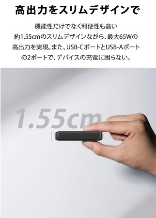 薄型充電器の中では、最高出力を誇る65Wのハイパワーを備えています。また、65Wクラスでは、最薄の1.55cmを実現しました。(※2022/4/27 MATECH調べ)
