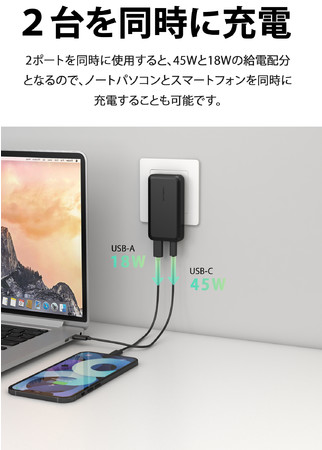 USB-C PD3.0に対応し、単ポート最大65Wで出力可能。高出力が必要な高性能ノートPCでも短時間で急速充電。MacBook Pro (14インチ、2021) であればわずか1時間30分で満充電可能です。また、USB-C 45W + USB-A 18W の2ポートの場合でも、最大63Wまでデバイスを充電することが可能です。