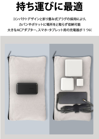MacBookだけでなく、PD対応のさまざまなWindows PCにも充電できます。一般的なWindows PCに同梱されているACアダプタに比べて非常に軽量かつコンパクトなサイズを実現しました。