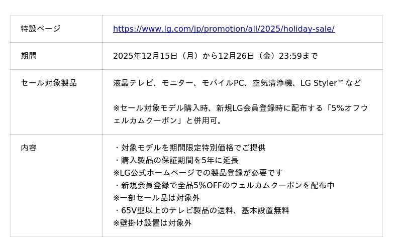 LGエレクトロニクス・ジャパン株式会社(代表取締役:孫 成周(ソン・ソンジュウ)、本社:東京都中央区)は、LG公式オンラインショップ今年最後のスペシャルセール『LG Holiday SALE 2025』(特設ページ:https://www.lg.com/jp/promotion/all/2025/holiday-sale/)を、本日2025年12月15日(月)から12月26日(金)23:59に開催します。