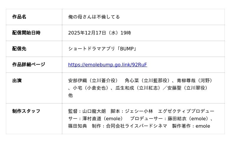 ショートドラマアプリ「BUMP」を運営する emole 株式会社(本社:東京都目黒区、代表取締役:澤村直道、以下 emole)は、完全オリジナル脚本によるショートドラマ『俺の母さんは不倫してる』を2025年12月17日(水)19:00よりBUMP独占配信いたします。