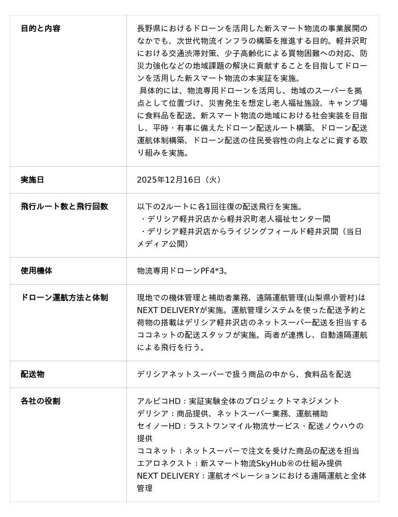 アルピコホールディングス株式会社(本社:長野県松本市、代表取締役社長:佐藤 裕一 以下アルピコHD)と株式会社デリシア(本社:長野県松本市、代表取締役社長:森 真也 以下デリシア)、セイノーホールディングス株式会社(本社:岐阜県大垣市、代表取締役社長:田口 義隆、以下 セイノーHD)、ココネット株式会社(本社:東京都中央区、取締役社長執行役員:堀井 拓次、以下ココネット)、株式会社エアロネクスト(本社:東京都渋谷区、代表取締役社長グループCEO:田路 圭輔、以下エアロネクスト)および株式会社NEXT DELIVERY(本社:山梨県小菅村、代表取締役:田路 圭輔、以下NEXT DELIVERY)は、2025年12月16日(火)に、長野県軽井沢町において、新スマート物流*1SkyHub(R)︎*2を活用した物流ドローンによる実証実験を共同で実施しました。本実証は、長野県軽井沢町における交通渋滞対策、少子高齢化による買物困難への対応、防災力強化などの地域課題の解決に貢献することを目的として実施したものです。