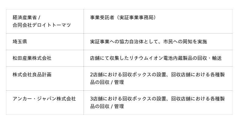 アンカー・ジャパンは、株式会社良品計画と共にこの度の実証実験の実施に民間企業として採用され、経済産業省、合同会社デロイトトーマツ、埼玉県、松田産業株式会社の計6社で共同の実証実験を実施いたします。2025年12月22日(月)から2026年1月23日(金)の期間限定で、Ankerグループ製品に加えて他社製品を含むリチウムイオン電池を内蔵した使用済みのモバイルバッテリー、ワイヤレスイヤホンを、埼玉県内のAnker Store 3店舗(Anker Store 越谷レイクタウン / Anker Store Outlet 入間 / Anker Store Outlet ふかや花園)にて回収いたします。