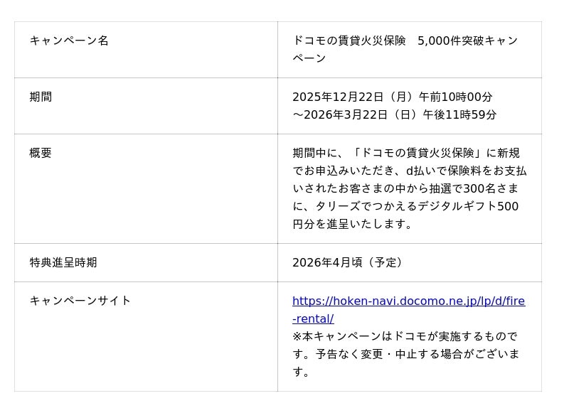 本保険の累計販売件数が5,000件を突破したことを記念して、タリーズで使える500円分のデジタルギフトが当たる「ドコモの賃貸火災保険 5,000件突破記念キャンペーン」を2025年12月22日(月)から2026年3月22日(日)まで開催します。
