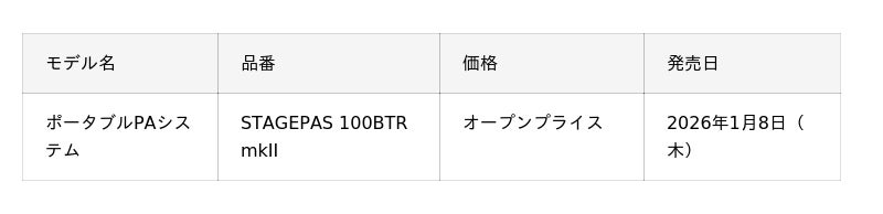 ヤマハ株式会社(以下、当社)は、プロフェッショナルオーディオ機器の新製品として、新たにUSB/Bluetooth(R)オーディオ入出力とUSB電源アダプターでの充電に対応した、シリーズ最小サイズ・バッテリー内蔵のポータブルPAシステム『STAGEPAS 100BTR mkII』を2026年1月8日(木)に発売します。