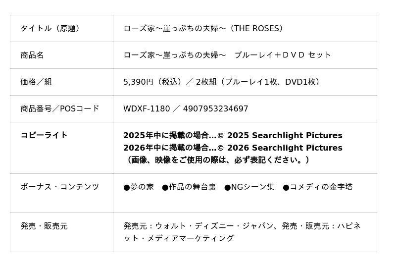 この度発売のブルーレイ+DVDセット、デジタル配信(購入)には、夢の夫婦を描いた「夢の家」を始め、物語のメイキング「作品の舞台裏」や「コメディの金字塔」、思わず笑ってしまう「NGシーン集」など、充実したボーナス・コンテンツを収録!痛快に、シビアに、そしてエモーショナルに描く最高級エンターテインメント『ローズ家〜崖っぷちの夫婦〜』を、ぜひブルーレイ+DVDセット、デジタル配信(購入/レンタル)で、お楽しみください!