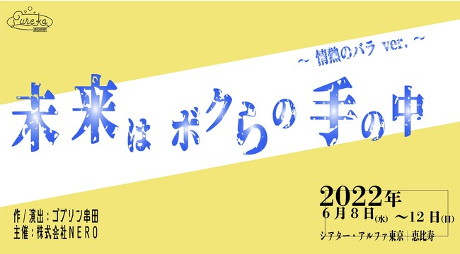 株式会社NERO(代表:杉本哲也)主催、エウレカ座『未来はボクらの手の中』が2022年6月8日 (水) 〜2022年6月12日 (日)にシアター・アルファ東京(東京都渋谷区)にて上演されます。チケットはカンフェティ(運営:ロングランプランニング株式会社、東京都新宿区、代表取締役:榑松 大剛)にて4月22日(金) 12:00より発売開始です。