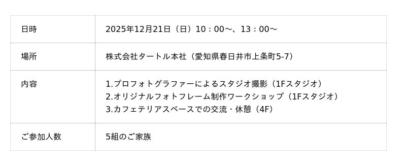 東海地方で20店舗のフォトスタジオ運営を行う株式会社タートル(本社:愛知県春日井市、代表取締役社長:亀山直樹)は、2025年12月21日(日)、タートル本社にて「家族でつくる わが家のフォトフレーム〜今年の笑顔を、カタチに残すワークショップ〜」を開催いたしました。本取り組みは、タートルとして初の試みとなる「フォトフレーム作り」と「プロによるスタジオ撮影(5カットデータ付)」をセットにした体験型イベントです。当日は多くのご家族にご参加いただき、制作と撮影を通じて「家族の絆」を深める時間を共有することができました。