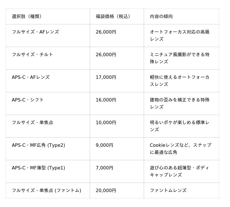 本福袋は、現行販売製品の大部分を対象としており、弊社が取り扱いのレンズ1本に加え、記念品(1点または複数点)をランダムで同梱いたします。