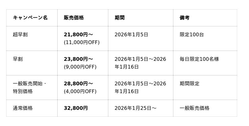 予約開始日から一般発売にかけて、段階的な割引キャンペーンを実施します。1月5日の「超早割」が最安値(21,800円)となります。