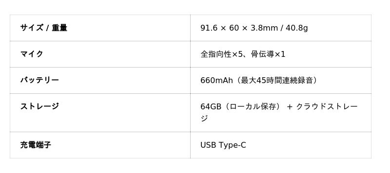 1. 圧倒的なハードウェア性能:品質とスタミナの両立薄さ3.8mm、重量40.8gのカードサイズボディに、フラッグシップ級の6マイクアレイ(全指向性マイク5基+骨伝導マイク1基)を搭載。5〜8メートルの遠距離集音を実現し、騒がしい環境でも話者の声をクリアに捉えます。連続録音45時間、待機時間60日間という驚異的なバッテリー性能により、大事な会議や出張でもバッテリー切れを心配する必要はありません。