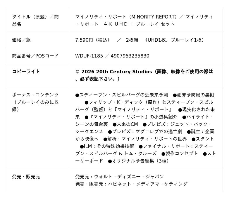 あの名作・傑作が4K UHDの超高画質で蘇る!!『マイノリティ・リポート』 4K UHD + ブルーレイ セット2026年3月18日(水)発売!