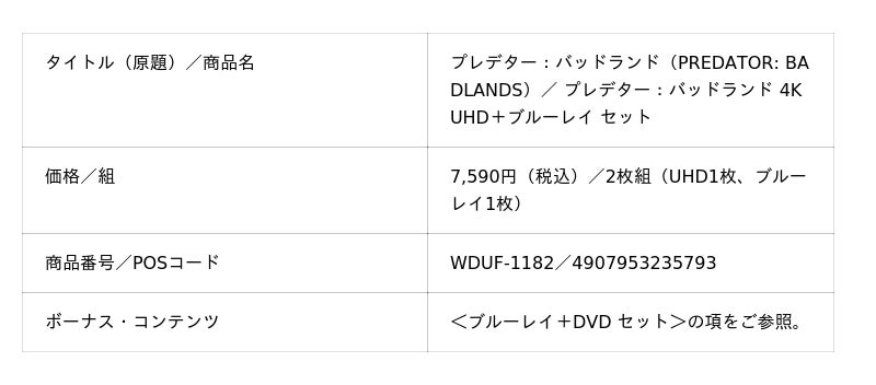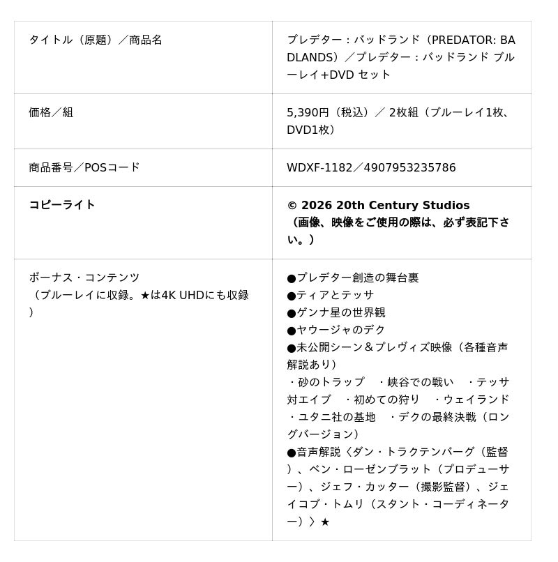 この度発売されるブルーレイ+DVDセット、4K UHD+ブルーレイ セット、デジタル配信(購入)には、「プレデター」新章の世界観を味わえる「プレデター創造の舞台裏」、初めてのプレデターの主人公デクに迫る「ヤウージャのデク」など、ファン必見のボーナス・コンテンツを収録。プレデターを主人公として描く完全新章『プレデター:バッドランド』を、ぜひブルーレイ+DVDセット、4K UHD+ブルーレイ セット、デジタル配信(購入/レンタル)で、お楽しみください。