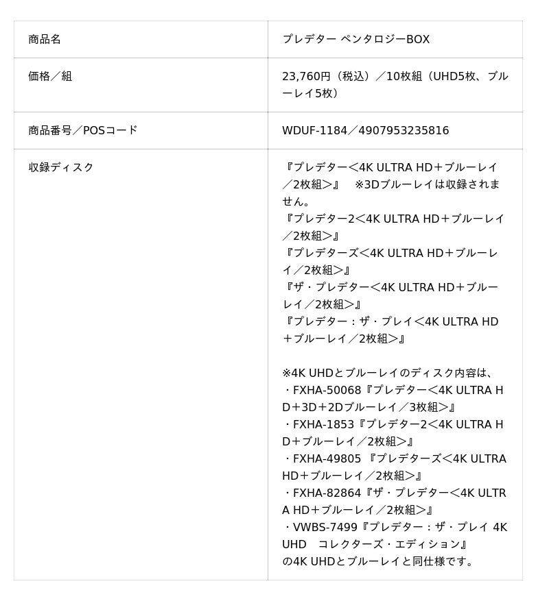 『プレデター ペンタロジーBOX<4K UHD+ブルーレイ/10枚組>』も同時発売決定!