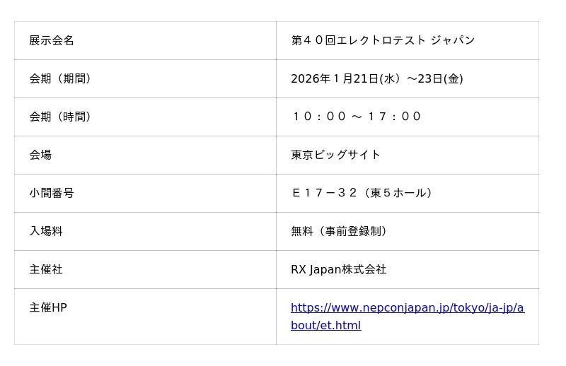 株式会社ミツトヨ(本社:川崎市高津区、代表取締役社長:沼田 恵明)は、2026年1月21日(水)から1月23日(金)まで、東京ビッグサイトにて開催される展示会「第40回エレクトロテスト ジャパン」に出展し測定機のソリューションなどを紹介します。